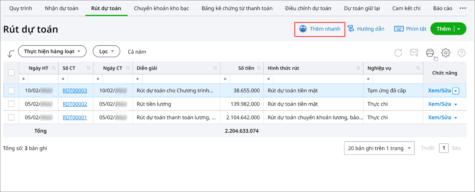 *Hiện tại, phần mềm chỉ đáp ứng chức năng Thêm nhanh từ AVA tại danh sách chứng từ Rút dự toán.