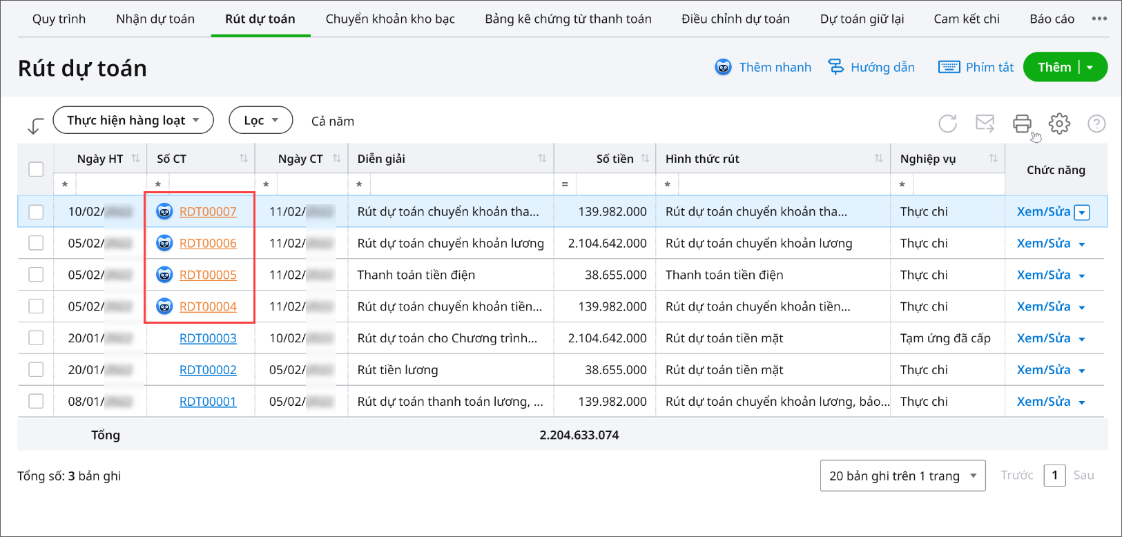 Bước 2: Nhấn vào loại chứng từ Rút dự toán cần thêm nhanh.