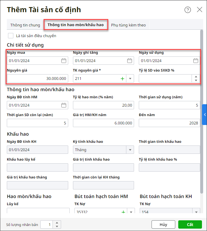 3. Khai báo thông tin tại mục Thông tin hao mòn/khấu hao.