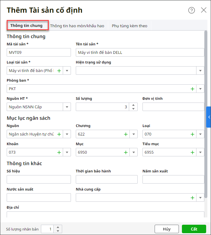 2. Khai báo thông tin tại mục Thông tin chung: Mã tài sản, Tên tài sản, Loại tài sản, Phòng/Ban, Nguồn HT và 1 số thông tin khác.