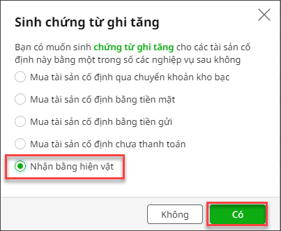 7. Chương trình tự động sinh chứng từ Nhận bằng hiện vật và ghi tăng tài sản cố định, hạch toán TK Nợ 211, TK Có 511.