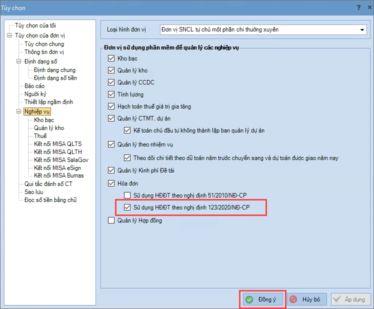 Tùy chọn thiết lập sử dụng HĐĐT theo NĐ123 Giúp đơn vị thiết lập sử dụng hóa đơn điện tử theo NĐ 123/2020/NĐ-CP. Các bước thực hiện: 1. Vào menu Hệ thống\Tùy chọn\Nghiệp vụ. 2. Tích chọn Sử dụng HĐĐT theo nghị định 123/2020/NĐ-CP. 3. Nhấn Đồng ý. Lượt xem: 376 Cập nhật 30/03/2022 Bài viết này hữu ích chứ? Có Không Bài viết liên quan Lập chứng từ thu phí, lệ phí cho các biên lai đã lập Lấy biên lai từ meInvoice Lập hóa đơn điều chỉnh Lập hóa đơn thay thế Thiết lập Email gửi hóa đơn (NĐ123, TT78) Lập hồ sơ để thông báo phát hành hóa đơn (NĐ123, TT78) Giải đáp miễn phí qua facebookNếu bạn vẫn còn thắc mắc hãy đăng câu hỏi vào cộng đồng MISA qua facebook để được giải đáp miễn phí và nhanh chóngĐĂNG BÀI NGAY