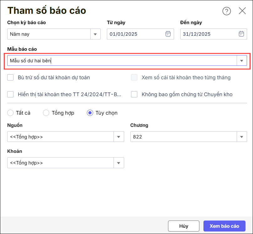 • Trên tham số báo cáo, chọn Mẫu báo cáo là Mẫu số dư hai bên.