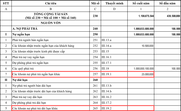 Bước 2: Kiểm tra và cộng tất cả số dư Có cuối kỳ của các TK 133, 138, 332, 333, 334, 338, 348 sẽ bằng với tổng 2 chỉ tiêu Các khoản nợ phải trả ngắn hạn khác (mã số 257) và chỉ tiêu Các khoản nợ phải trả dài hạn khác (mã số 265) trên B01/BCTC: Báo cáo tình hình tài chính.