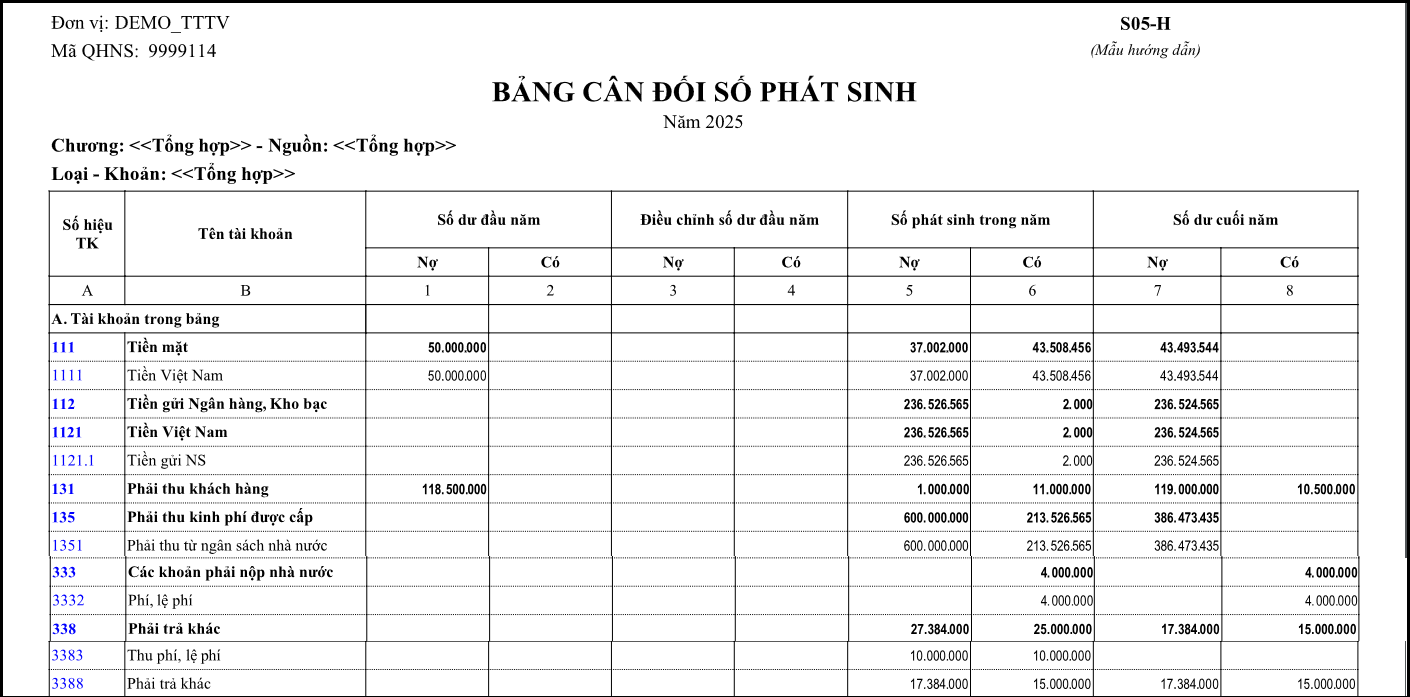Bước 3: In lại sổ S05-H: Bảng cân đối số phát sinh & Báo cáo B01/BCTC để kiểm tra số liệu.