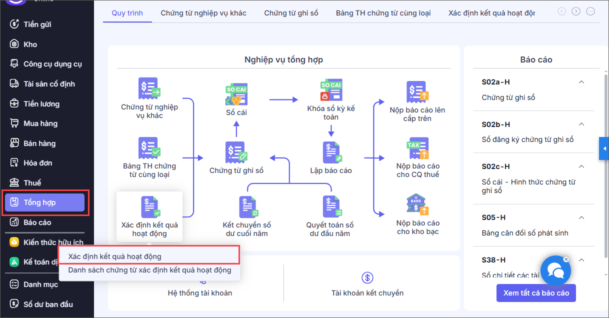 Bước 1: Vào phân hệ Tổng hợp, chọn Xác định kết quả hoạt động.