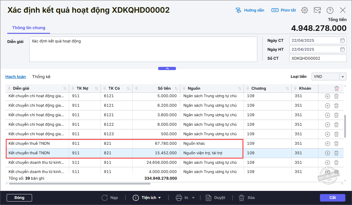 Sau đó, lập chứng từ Kết chuyển hoạt động kinh doanh => phần mềm lấy lên số Kết chuyển thuế TNDN với các nguồn khác nhau.