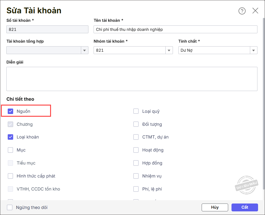 - Tích chọn Chi tiết theo Nguồn. Nhấn Cất.