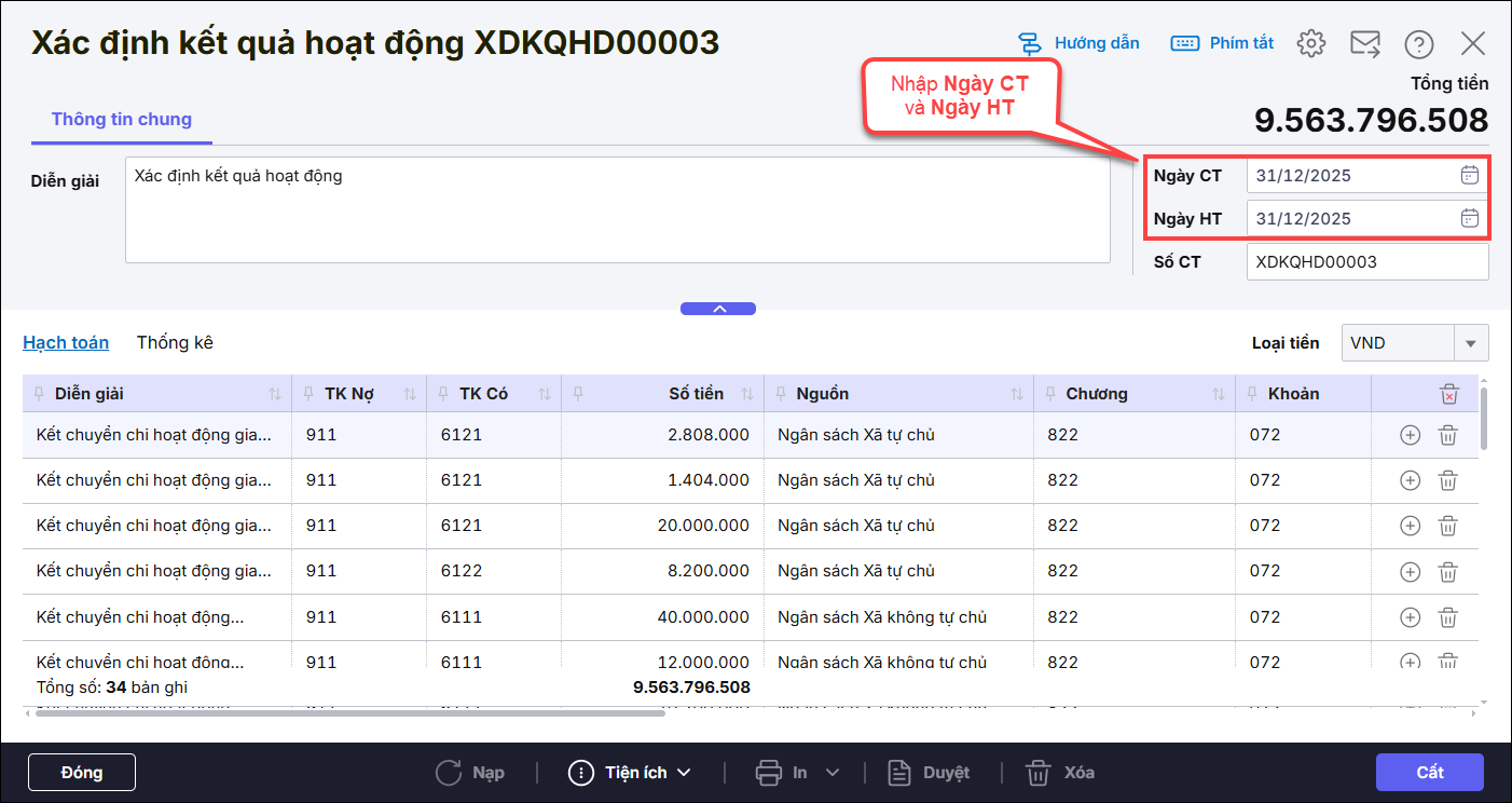 Bước 3: Phần mềm tự động Kết chuyển doanh thu, chi phí, anh/chị chọn hoạt động sự nghiệp (nếu cần).