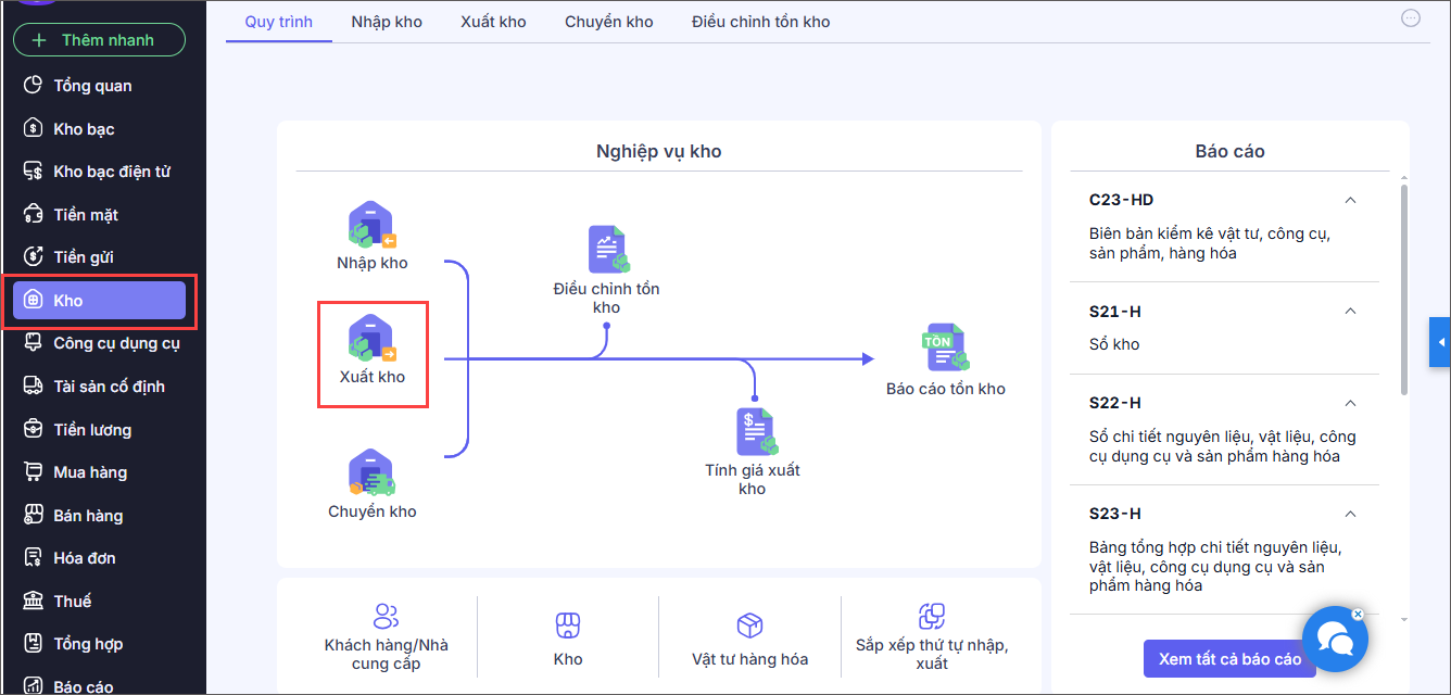 Bước 1: Vào menu Kho\Quy trình, chọn Xuất kho.