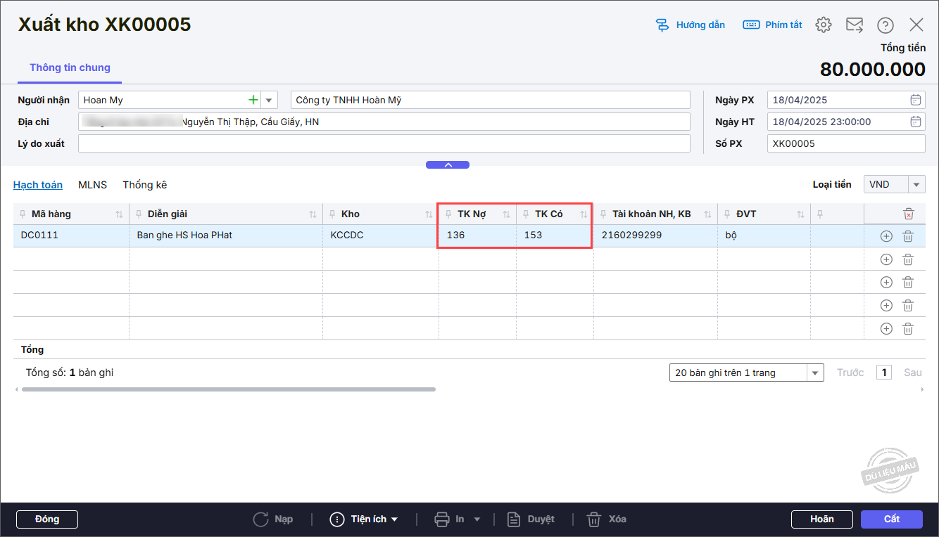 - Chọn Tài khoản Nợ, Có nhập Số lượng.
