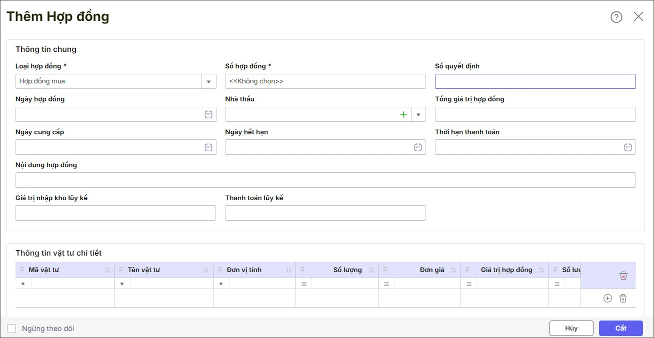 - Nhập các Thông tin chung: Tên hợp đồng, Số hợp đồng, Ngày hợp đồng,…