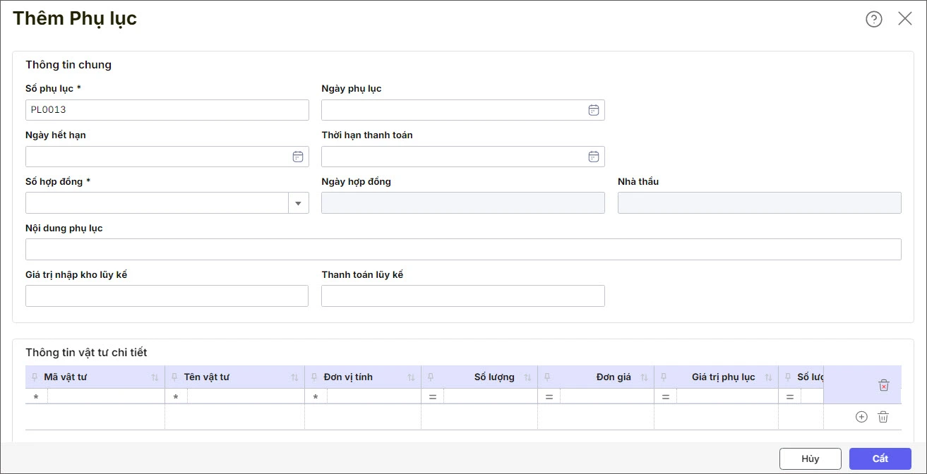 - Nhập các Thông tin chung: Số phụ lục, Ngày phụ lục, Số hợp đồng,…