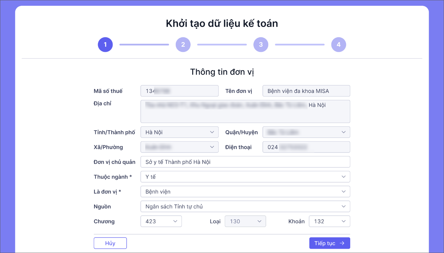 • Các thông tin Mã số thuế, Tên đơn vị, Địa chỉ, Điện thoại sẽ mặc định lấy theo thông tin trên Giấy phép sử dụng không được sửa lại.