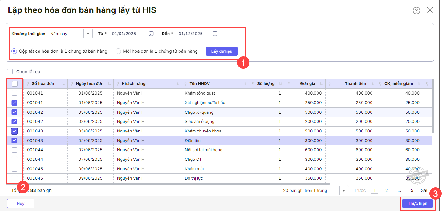 5. Tích chọn các hóa đơn cần lấy về. Nhấn Thực hiện.