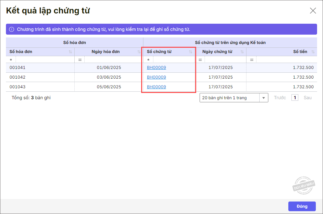 6. Nhấn vào Số chứng từ tại phần Kết quả lập chứng từ để xem chi tiết.