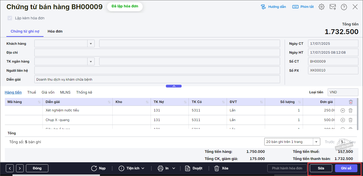 7. Nhấn Sửa để bổ sung thêm thông tin cho chứng từ hoặc nhấn Ghi sổ để ghi sổ chứng từ.