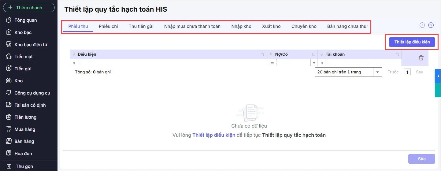 Bước 3: Chọn vào loại chứng từ cần thiết lập. Nhấn Thiết lập điều kiện.