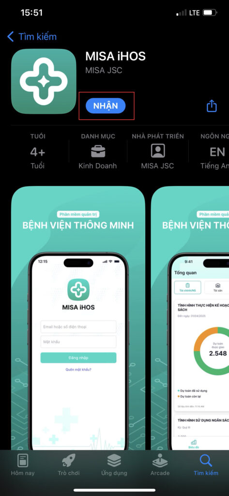– Vào ứng dụng Appstore, tìm kiếm “MISA iHOS”. Chọn ứng dụng MISA iHOS và nhấn vào nút Nhận.