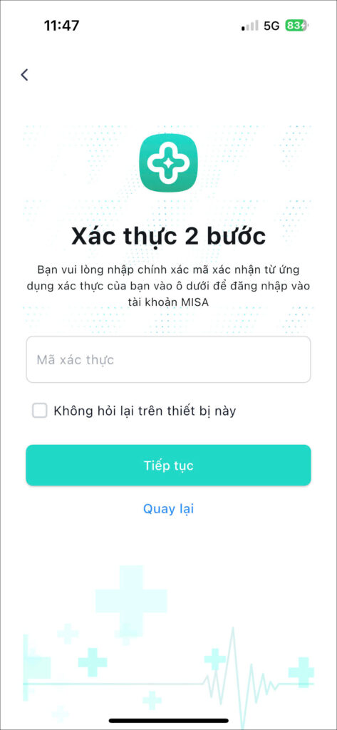 – Nhập mã xác thực 2 bước (Mã xác thực lấy từ ứng dụng xác thực hoặc email, số điện thoại, tùy vào phương thức xác thực anh/chị đã thiết lập trên phần mềm bản website).