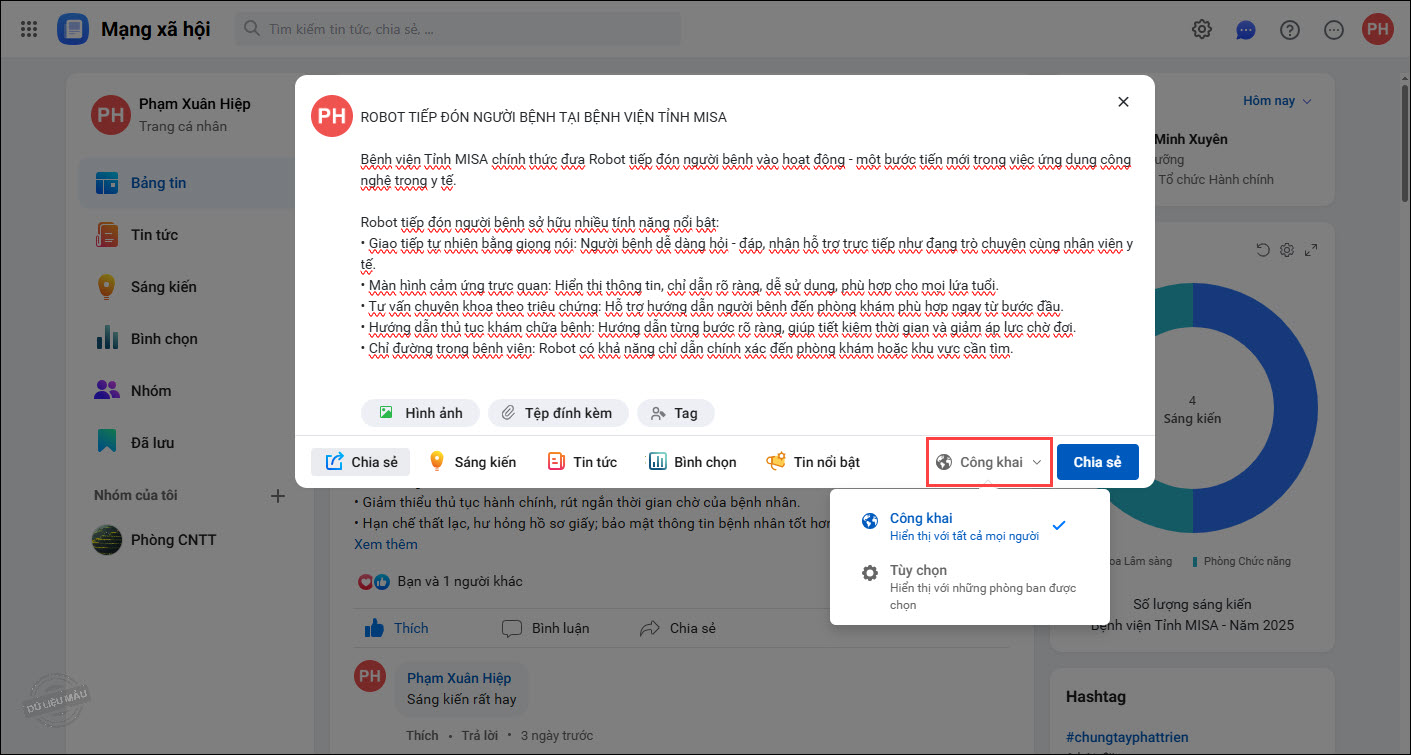 4. Chương trình mặc định thiết lập hiển thị công khai bài chia sẻ (Toàn bộ CBNV trong đơn vị có thể xem bài viết).