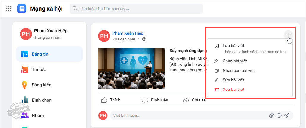 5. Sau khi đăng tin tức, có thể nhấn vào biểu tượng ⋯ để thực hiện các chức năng: