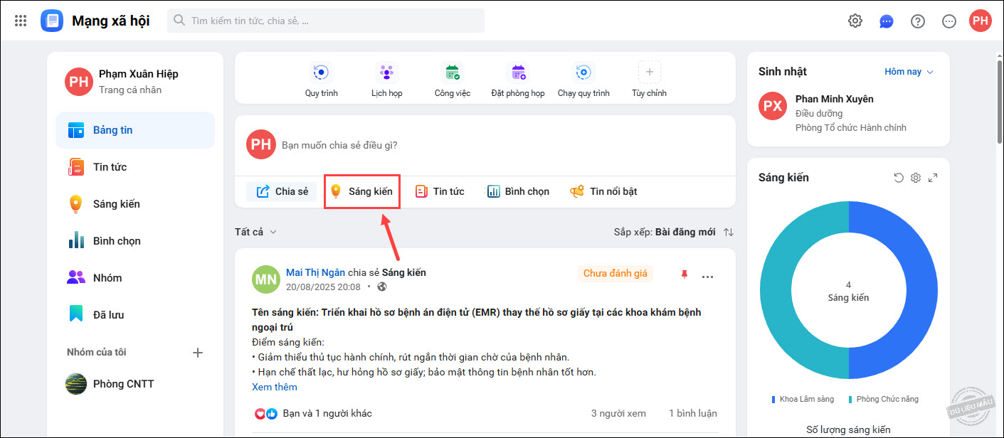 1. Trên giao diện Bảng tin, tại phần chia sẻ bài viết, chọn Sáng kiến.