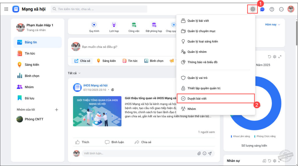 Tính năng Duyệt bài viết cho phép xét duyệt bài viết trước khi đăng lên bảng tin để kiểm soát thông tin, tránh tình trạng nhân viên đăng bài với nội dung không phù hợp. Tính năng đáp ứng cho vai trò Quản trị hệ thống, Quản trị ứng dụng hoặc người được phân quyền quản lý chuyên mục.