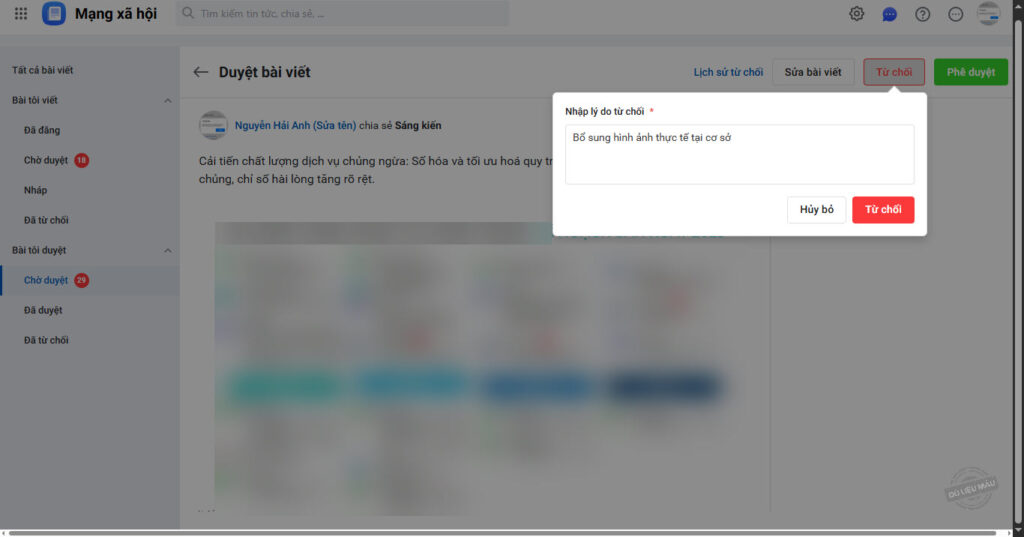 - Nếu từ chối duyệt bài viết thì chọn Từ chối. Nhập lý do từ chối, sau đó nhấn Từ chối.