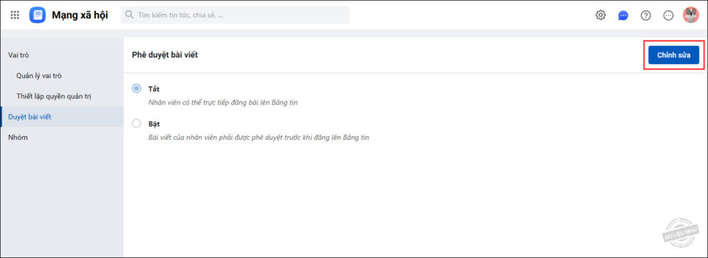 - Tích chọn Bật. Anh/chị có thể chọn các mục cần phê duyệt trước khi đăng hoặc bật phê duyệt cho tất cả.
