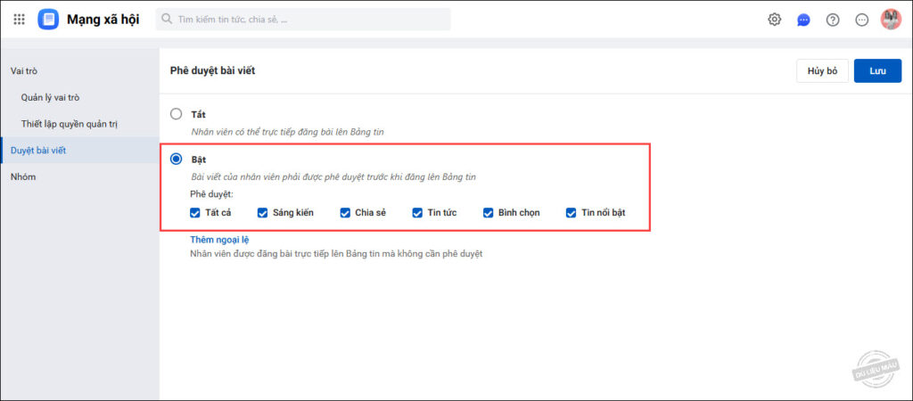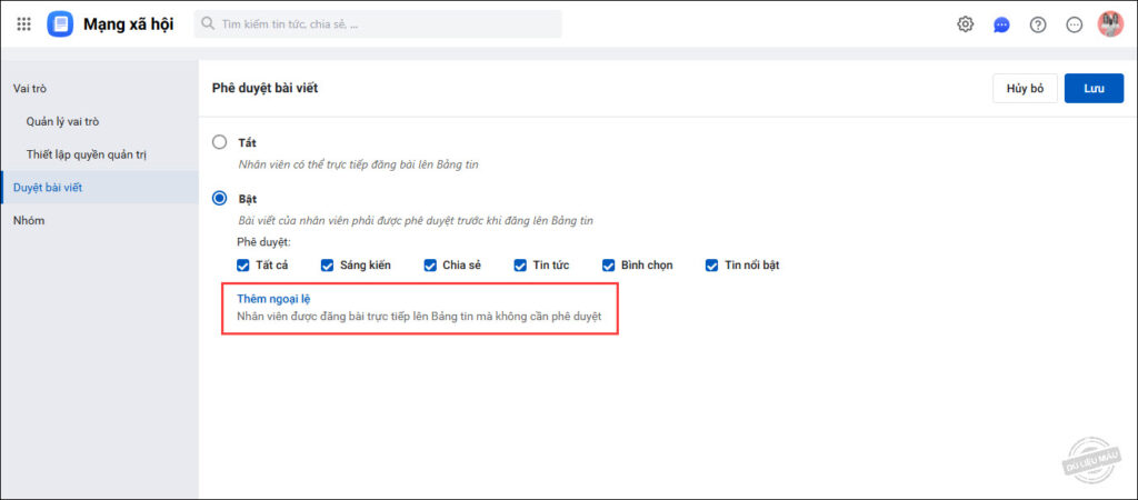 - Trường hợp muốn cho phép một số nhân viên được đăng bài trực tiếp mà không cần qua phê duyệt, chọn Thêm ngoại lệ.