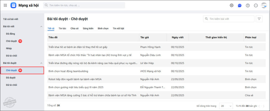 - Anh/chị xem danh sách bài chờ duyệt tại mục Bài tôi duyệt\Chờ duyệt.