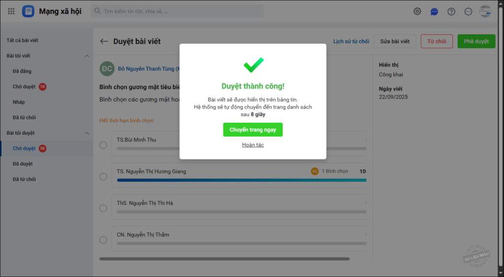 - Nếu đồng ý phê duyệt bài viết thì chọn Phê duyệt. Hệ thống sẽ thông báo duyệt thành công và bài viết sẽ hiển thị trên bảng tin.