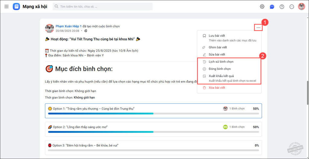 - Đối với cuộc bình chọn do mình tạo, anh/chị có thể xem Lịch sử bình chọn, Đóng bình chọn và Xuất khẩu kết quả bình chọn.