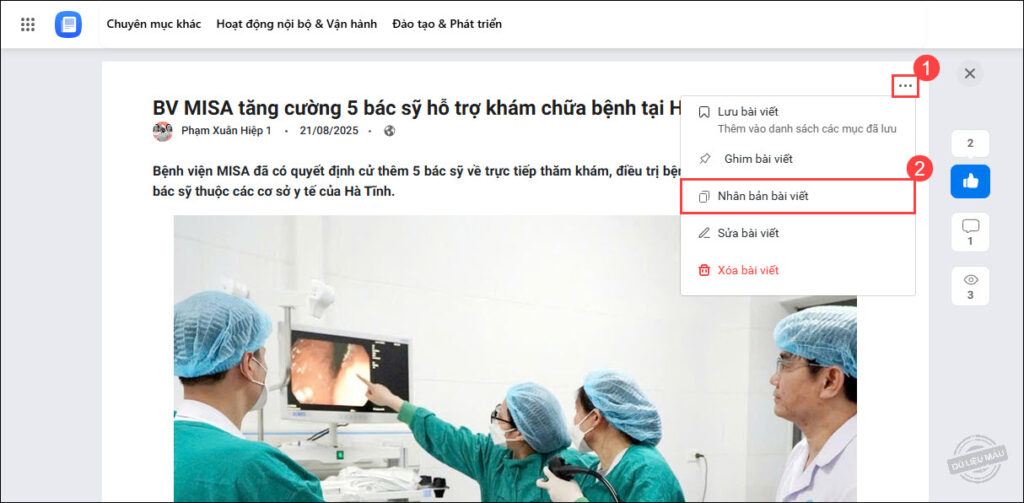- Anh/chị có thể nhân bản bài viết để thêm nhanh 1 bài có nội dung, thiết lập tương tự bài đã có để tiết kiệm thời gian nhập liệu. Nhấn vào biểu tượng ⋯, chọn Nhân bản bài viết.