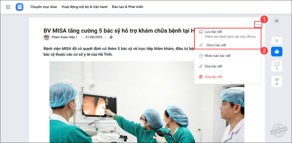 - Ngoài ra, anh/chị cũng có thể lưu bài viết và danh sách lưu trữ hoặc ghim bài viết lên đầu Bảng tin bằng cách nhấn vào biểu tượng ⋯ và chọn chức năng tương ứng.