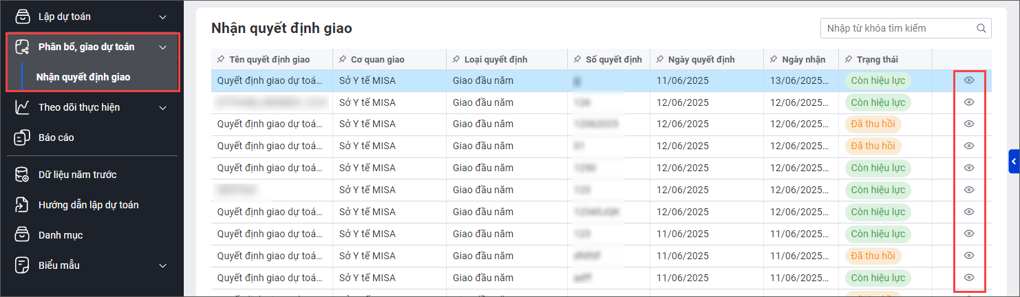 1. Vào mục Phân bổ, giao dự toán. Chọn Nhận quyết định giao.