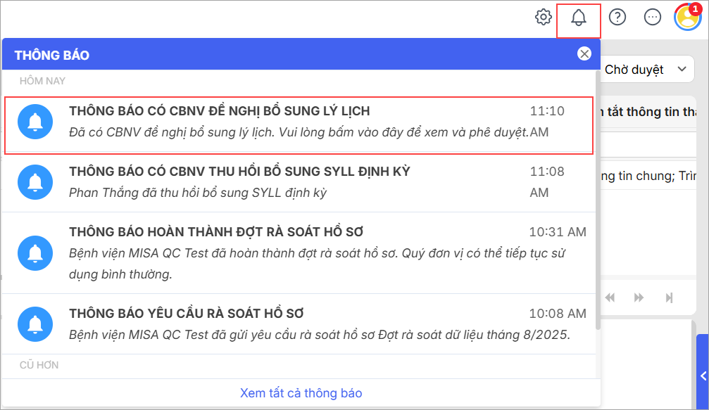 1. Đối với CBTC. Anh/chị có thể nhận được thông báo tức thời khi có đợt yêu cầu bổ sung lý lịch định kỳ/cập nhật hồ sơ nếu có thay đổi từ cấp trên.