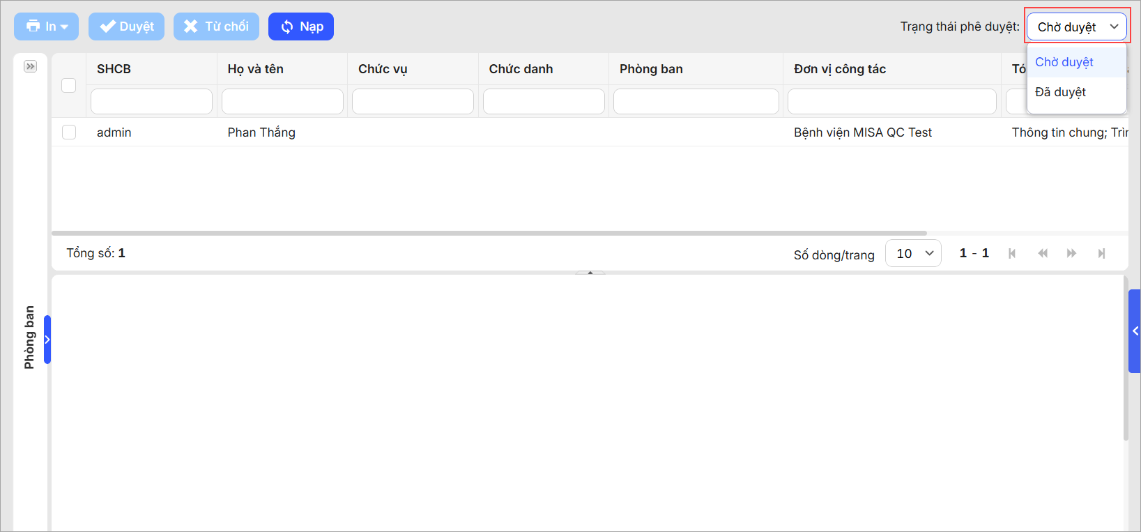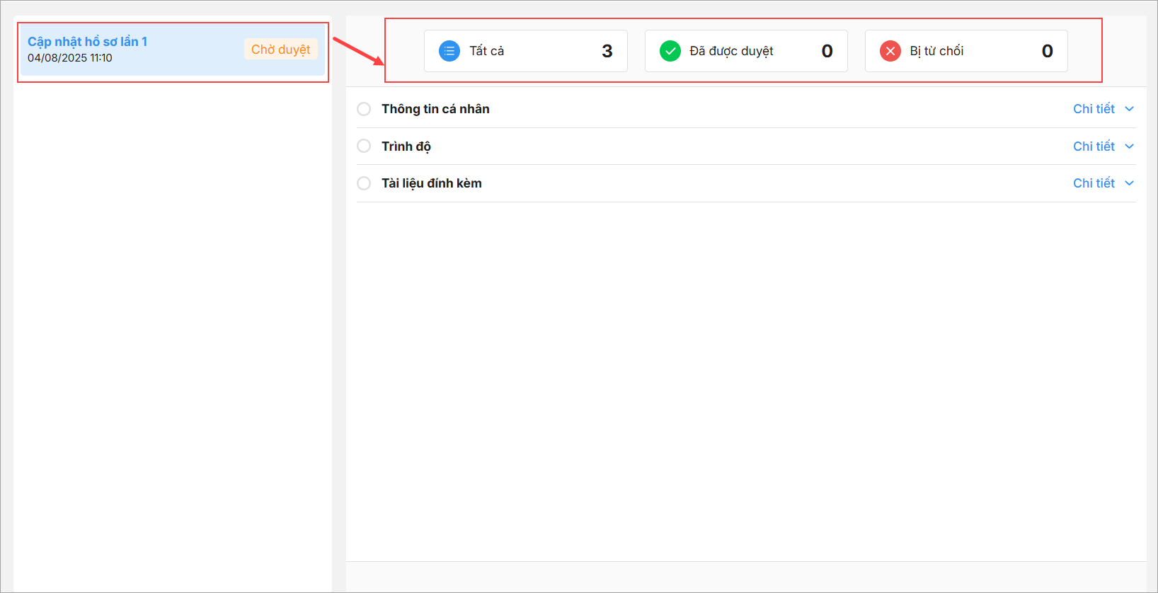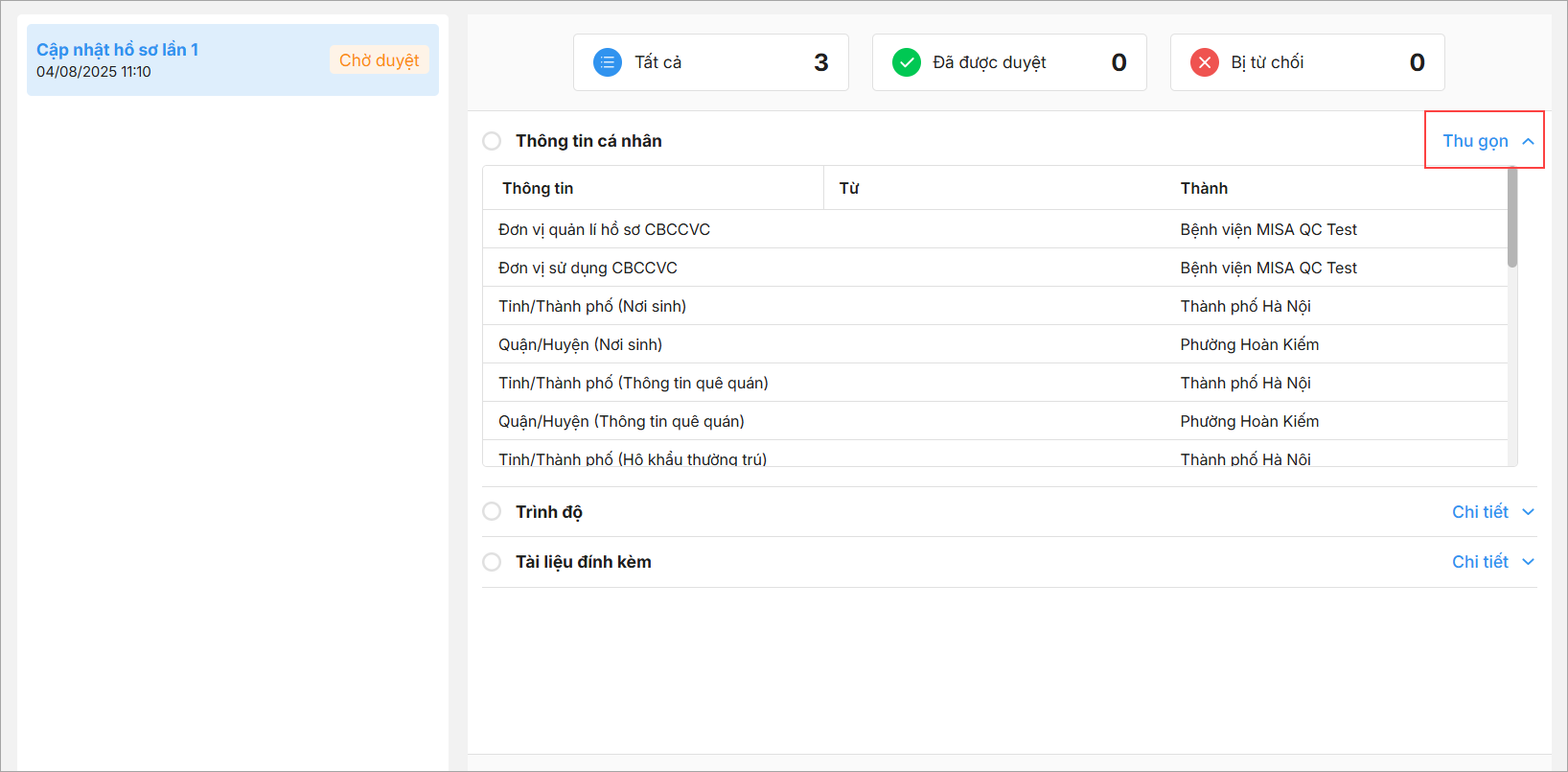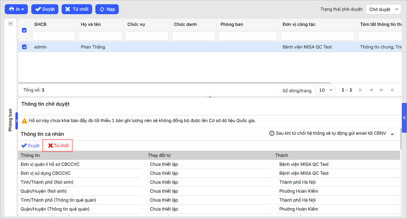 2. Hồ sơ CBNV đã cập nhật sẽ được hiển thị ở trạng thái Chờ phê duyệt. CBTC kiểm tra từng mục thông tin đã thay đổi để phê duyệt hoặc từ chối phê duyệt hồ sơ.