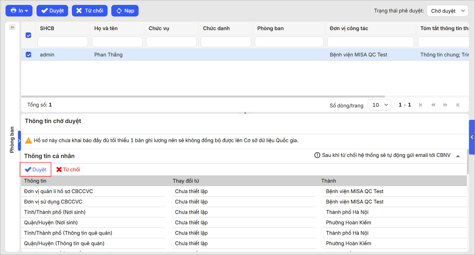 3. Nếu thông tin thay đổi chính xác, đạt điều kiện, nhấn Duyệt và xác nhận cập nhật thông tin vào hồ sơ CBNV.