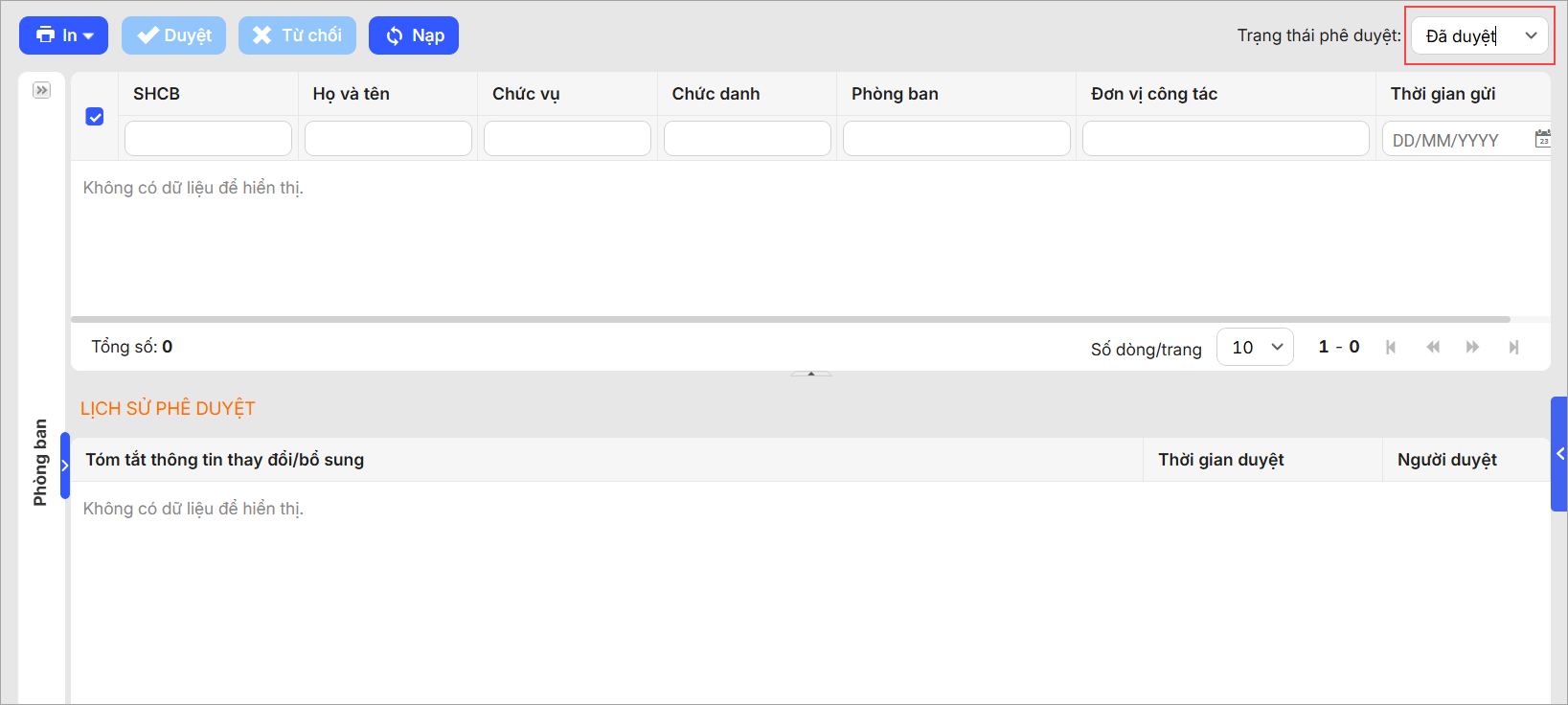 • Tại đây, CBTC có thể theo dõi lịch sử các lần phê duyệt hồ sơ CBNV.
