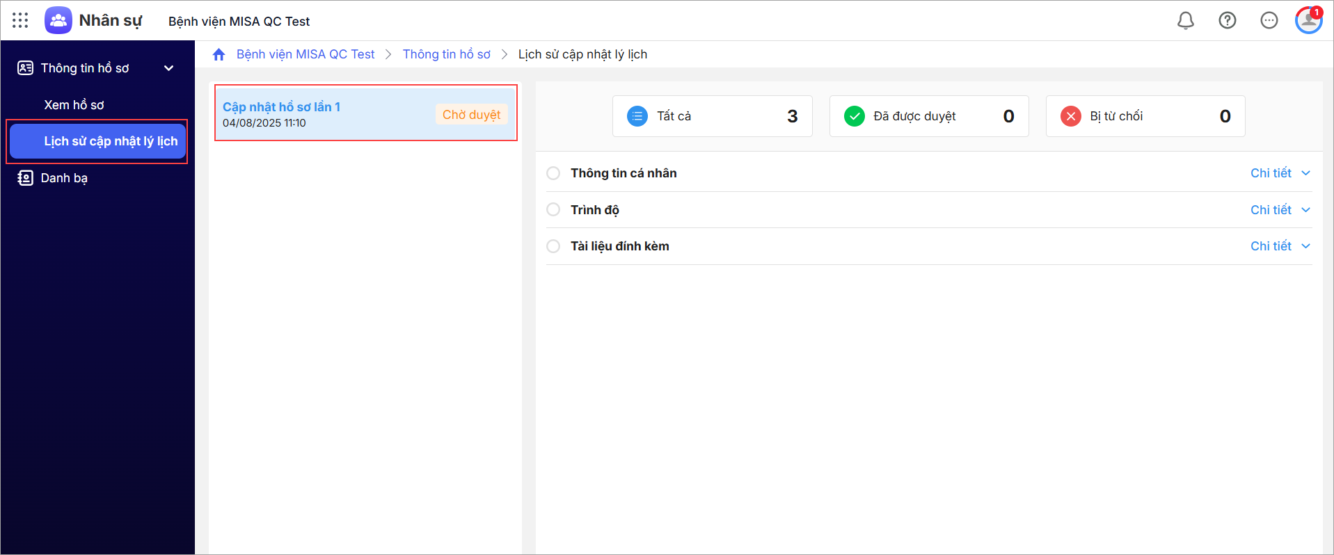 Sau khi CBTC kiểm tra hỗ trơ, CBNV đăng nhập vào tài khoản của mình, vào menu Thông tin hồ sơ\Lịch sử cập nhật lý lịch để theo dõi trạng thái duyệt hồ sơ