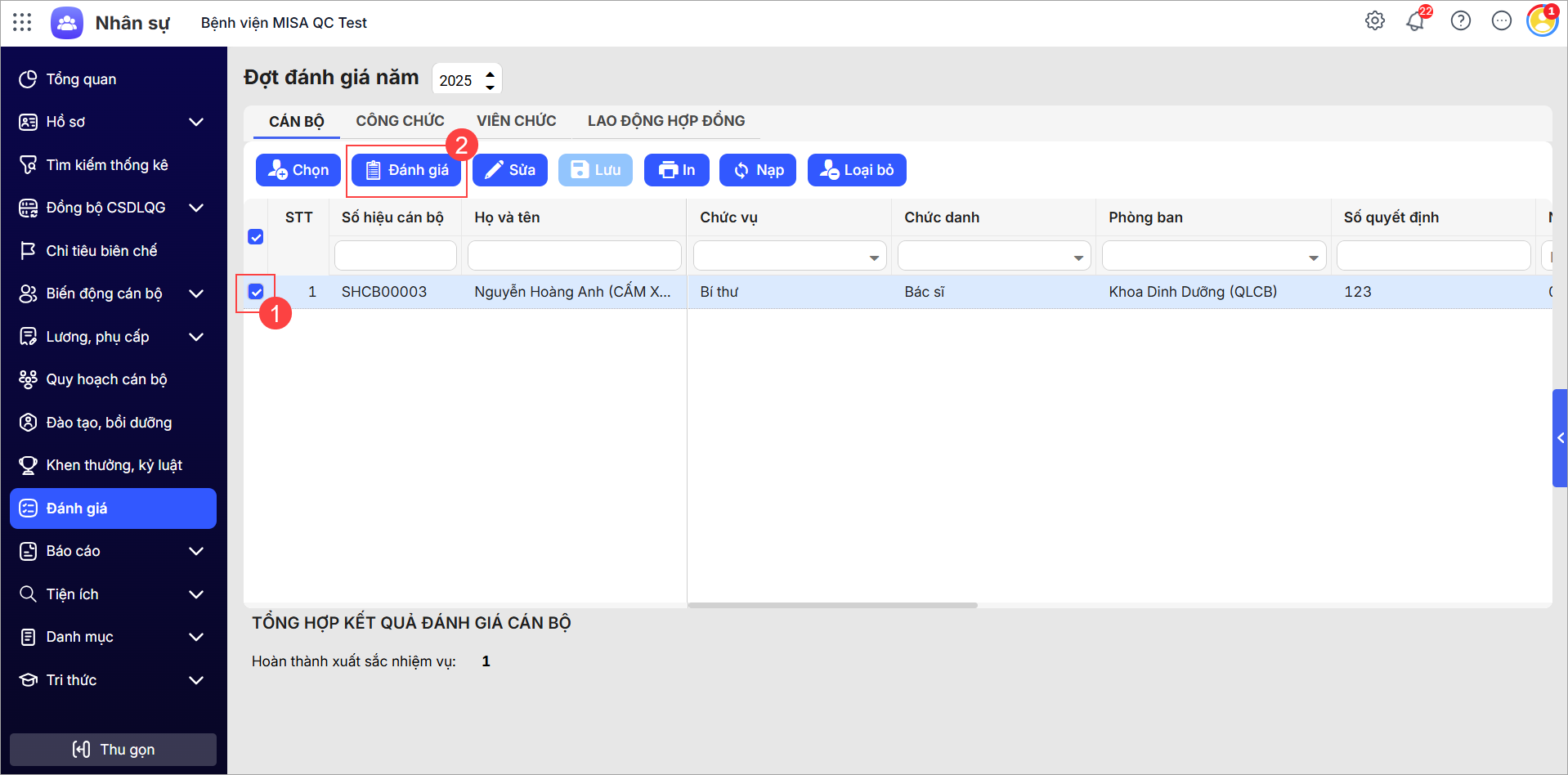 - Anh/chị vào menu Đánh giá, tại tab Cán bộ, chọn một hoặc nhiều cán bộ, sau đó nhấn nút Đánh giá để thực hiện đánh giá.