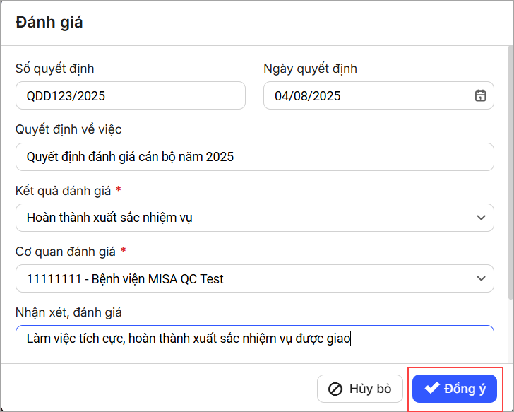 - Số quyết định: Nhập số văn bản quyết định chính thức liên quan đến kết quả đánh giá (ví dụ: QĐ123/2025).