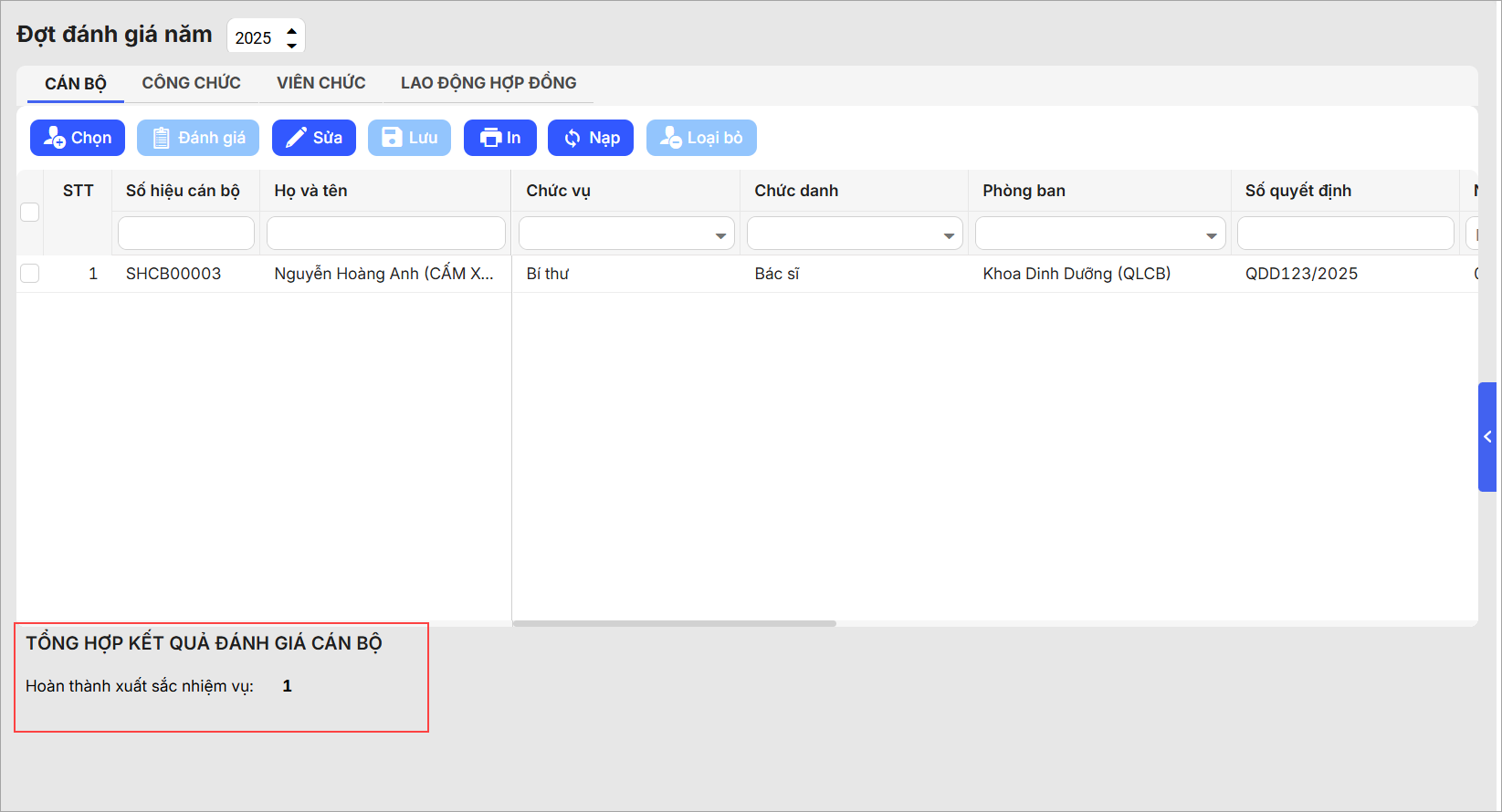 - Nạp: Load lại dữ liệu đánh giá hoặc danh sách cán bộ để cập nhật thông tin mới nhất.