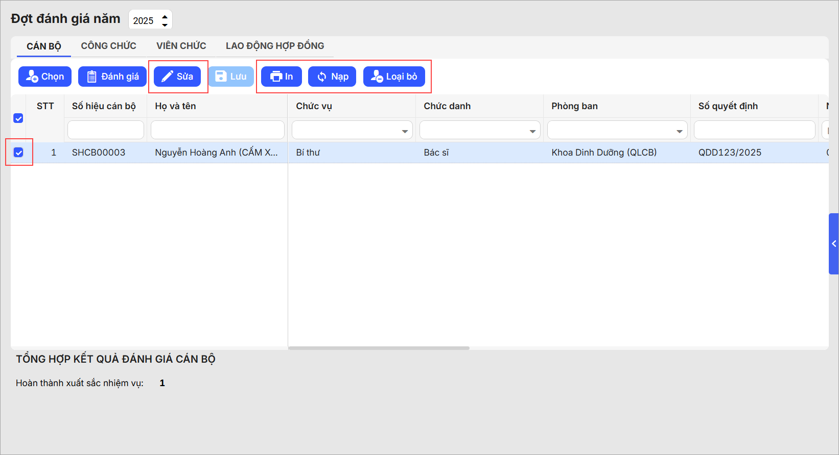 - Tích chọn một hoặc nhiều cán bộ để thao tác tiếp theo như đánh giá, sửa, xoá.