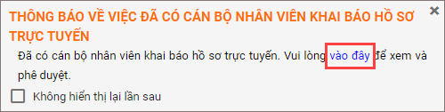 1. Sau khi đăng nhập vào chương trình sẽ hiển thị thông báo về việc đã có cán bộ nhân viên khai báo hồ sơ trực tuyến. Nhấn vào link vào đây để xem chi tiết hồ sơ.