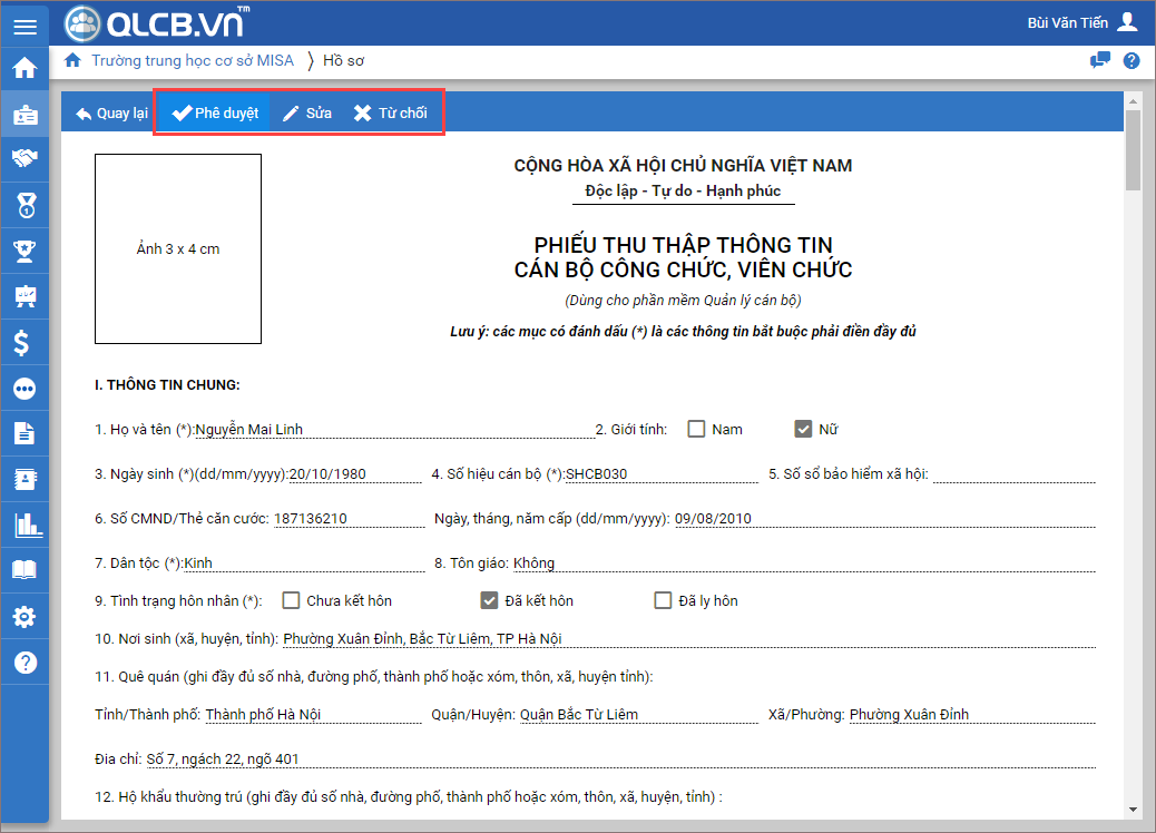 • Nhấn Sửa nếu CBTC muốn sửa thông tin cho CBNV => Sau khi sửa xong thì thực hiện phê duyệt hồ sơ.