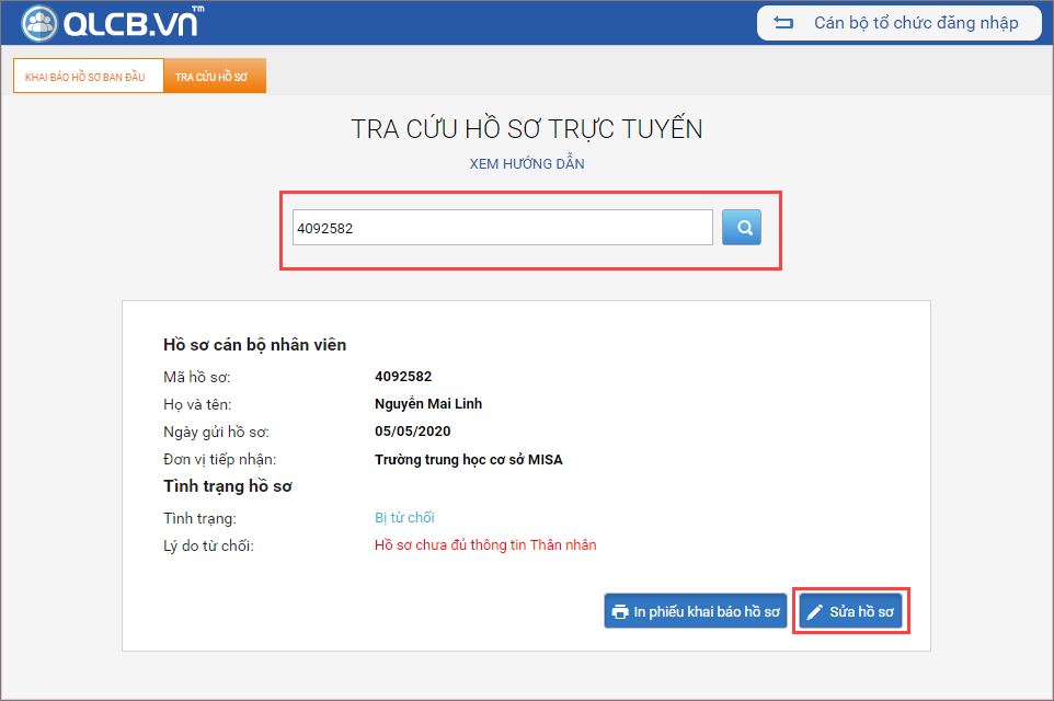 • CBNV tra cứu hồ sơ bằng cách nhấn Tra cứu hồ sơ, nhập Mã hồ sơ (xem mã hồ sơ trong email).