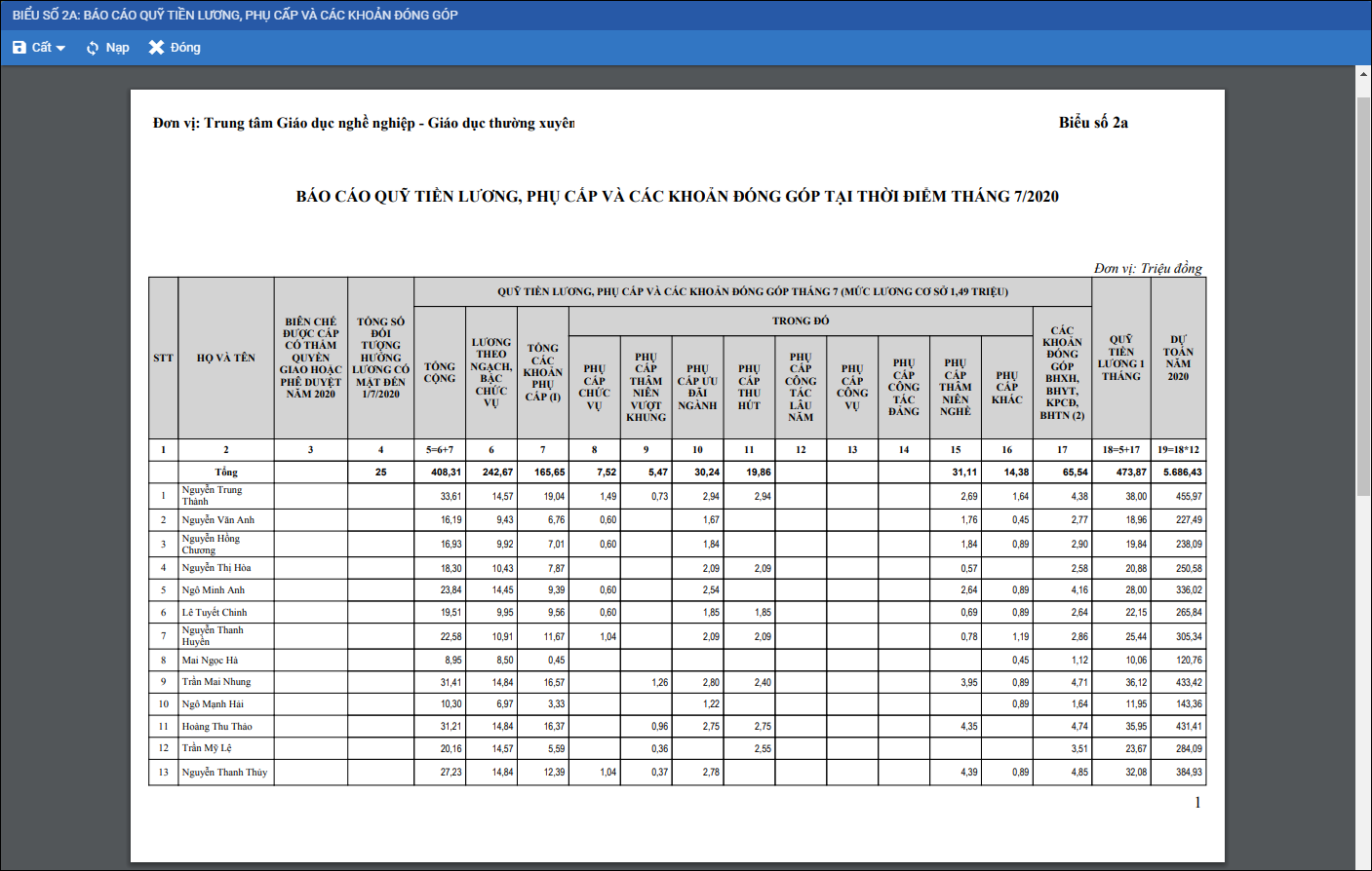 • Mẫu biểu 2a: Tổng hợp quỹ lương, phụ cấp và các khoản đóng góp theo năm.